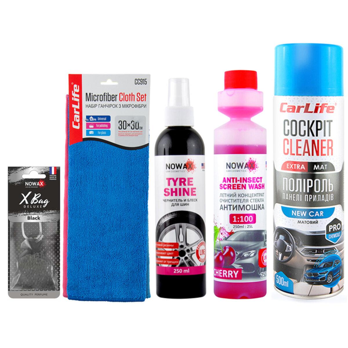 Набір складається: Поліроль для панелі приладів CarLife Cockpit Cleaner EXTRA MAT Нова машина, 500мл CF524 Ганчірка з мікрофібри CarLife 30x30 см.,набір 3шт (для полірування та скла) CC915 Ароматизатор Nowax X Bag Delux Black NX07585 Концентрат Nowax Anti Insekt Cherry 250мл NX25225 Чорнитель і блиск для шин Nowax Tyre Shine, 250мл NX25230